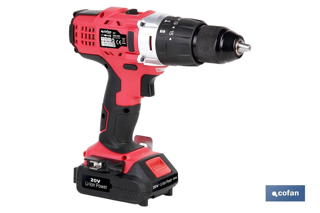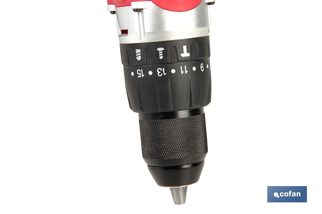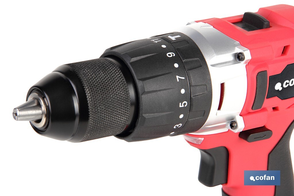 Berbequim e aparafusadora de 2 velocidades, com 16 posições de aperto, controle de velocidade variável e seletor de rotação esquerda/direita. Com luz de trabalho Led e clipe de metal para fixação ao cinto. Inclui mala com 13 peças e carregador de bateria.