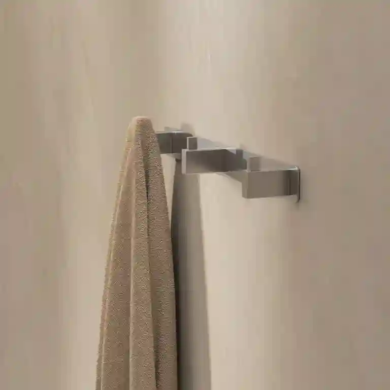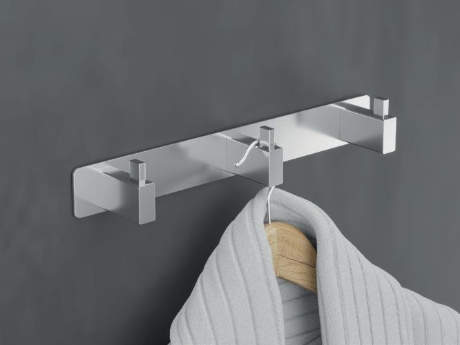 Disponível em várias cores e acabamentos — ouro mate, rosa ouro mate, cromado, preto, níquel e black gun metal— o cabide triplo Technic adapta-se a qualquer estilo de decoração. Os tons metálicos transmitem sofisticação e luminosidade, enquanto as versões escuras acrescentam contraste e personalidade. Cada acabamento foi pensado para criar harmonia com torneiras, perfis de vidro e outros acessórios da casa de banho.