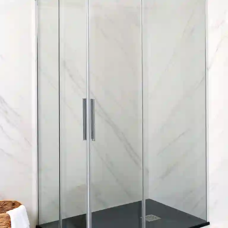 A cabine de duche moderna Palmyra representa o equilíbrio perfeito entre design contemporâneo e praticidade diária. Concebida para se instalar num canto ou num plano contínuo, esta cabine em vidro temperado de 6 mm oferece um refúgio de vidro cristalino enquadrado por perfis slim em alumínio anodizado. As portas de correr movem-se suave e silenciosamente sobre trilhos ocultos, garantindo um acesso amplo ao interior sem comprometer o espaço exterior. É o sistema ideal para casas de banho que exigem leveza visual e máxima fluidez no movimento.