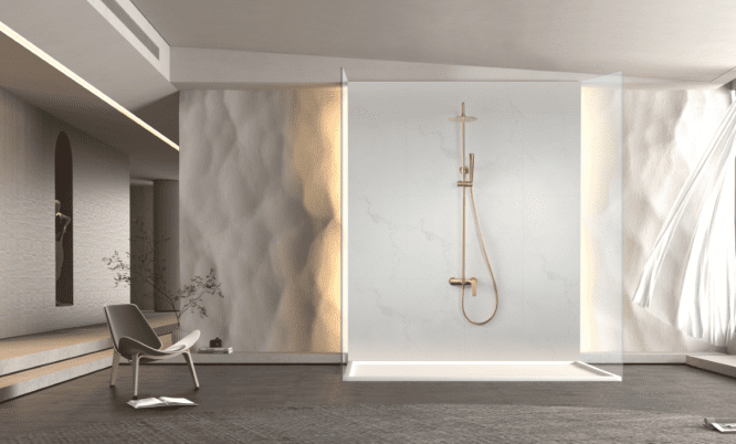 Pensada para ambientes que valorizam o equilíbrio entre estética e usabilidade, esta coluna combina harmoniosamente com diferentes materiais – desde revestimentos cerâmicos neutros até mármores ou pedras naturais. O seu design versátil e compacto permite fácil integração em zonas de duche de vários tamanhos, mantendo sempre uma imagem limpa e organizada.