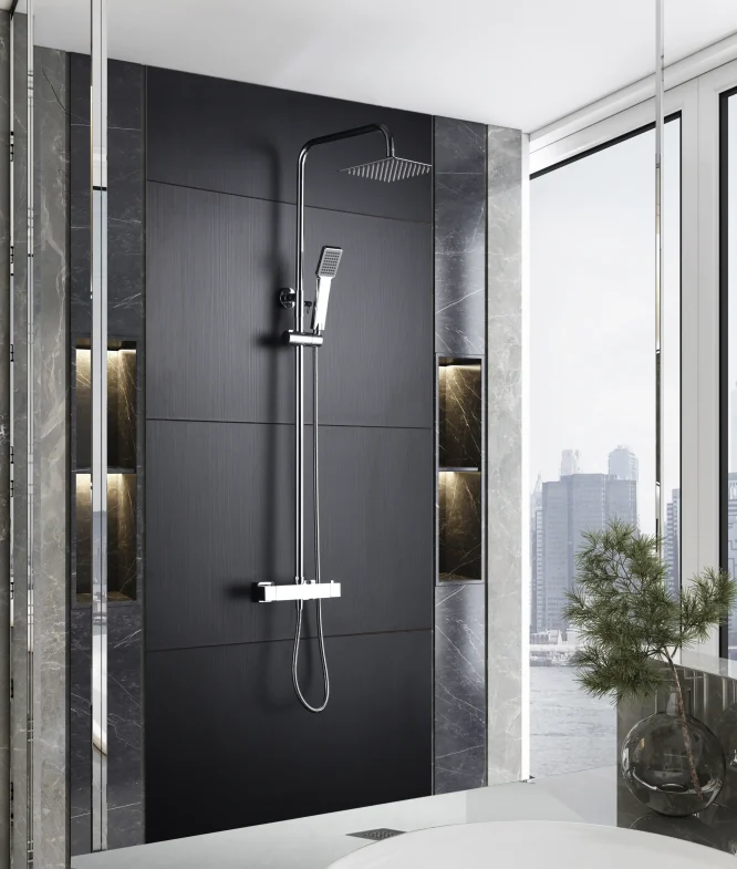 A coluna de duche termostática Art é uma afirmação de design geométrico e precisão funcional. Com linhas marcadas e proporções arquitetónicas, esta peça alia estética forte a um sistema de controlo térmico fiável — oferecendo uma experiência de banho tão confortável quanto visualmente impactante.
