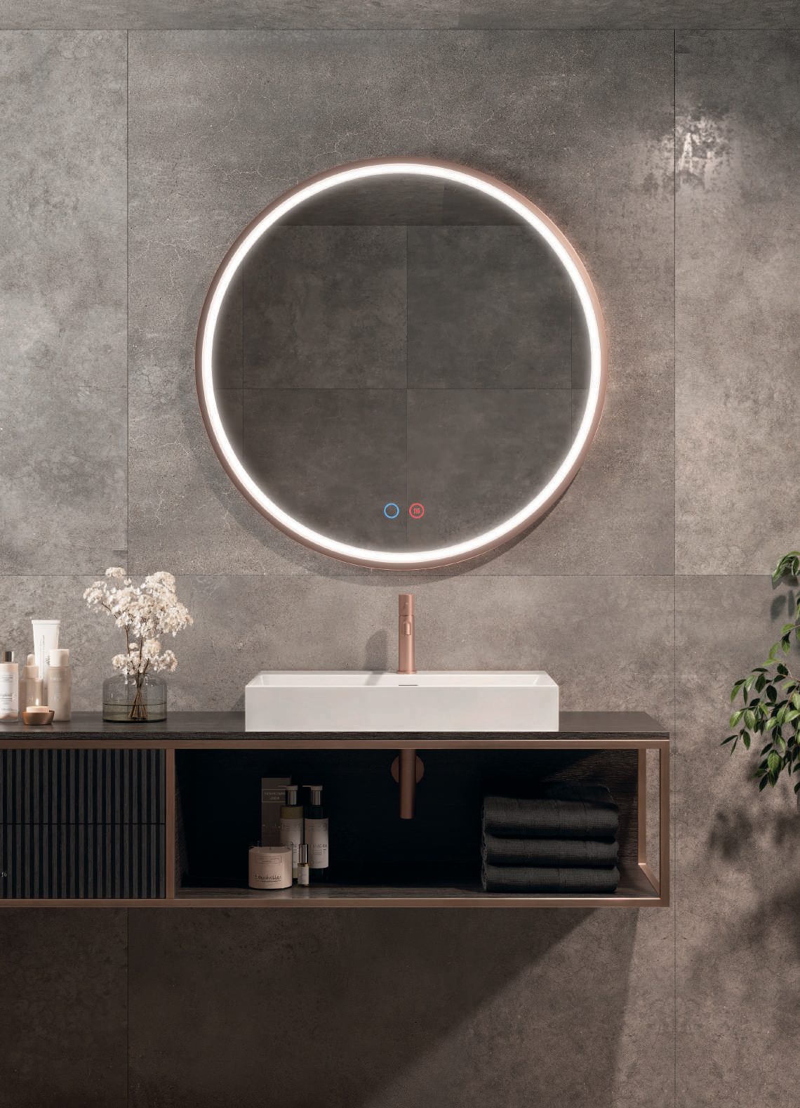 O espelho está disponível com moldura em alumínio nas cores preto, dourado ou rosa ouro, permitindo combinações sofisticadas em espaços minimalistas, românticos ou contemporâneos. O formato redondo transmite suavidade e fluidez visual, tornando-o ideal para casas de banho elegantes, zonas de beleza ou entradas com personalidade.