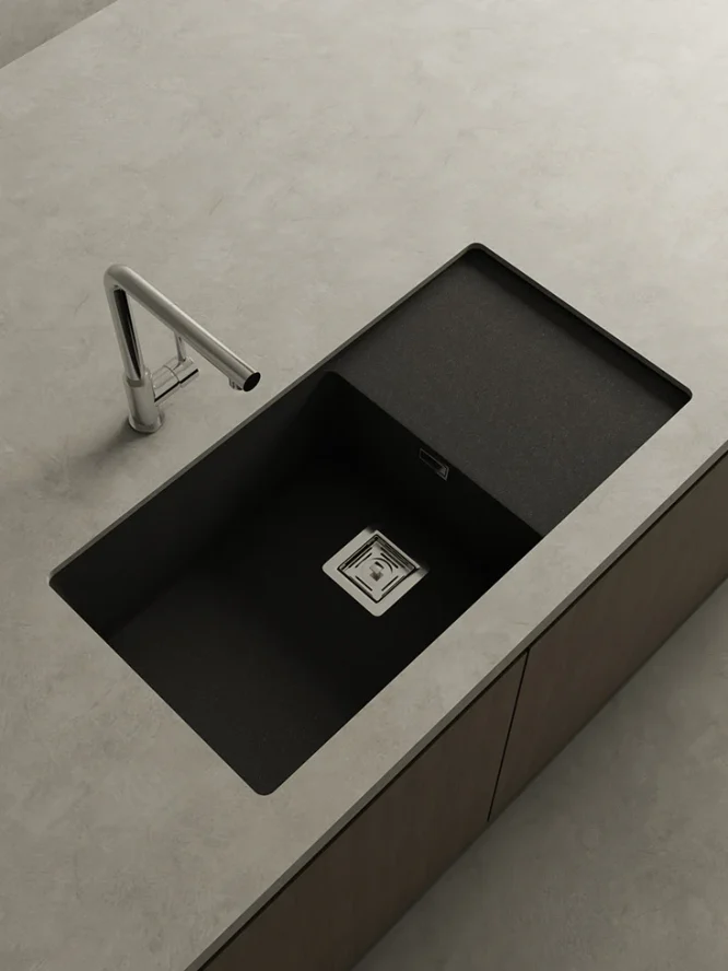 O lava-loiça Zie é uma solução moderna e prática para cozinhas elegantes. Com uma profundidade de 20 cm, esta peça oferece uma cuba espaçosa e um escorredor integrado que direciona a água diretamente para a cuba, facilitando o processo de secagem de louças.