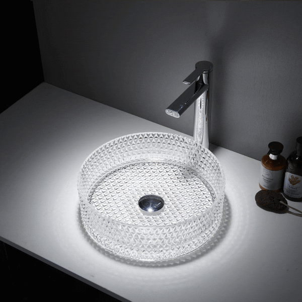 A sua forma arredondada e a superfície texturizada conferem-lhe um caráter contemporâneo e artístico. O efeito translúcido do vidro, combinado com o trabalho detalhado na superfície, reflete a luz de forma fascinante, criando um jogo de brilhos que eleva a estética da casa de banho. À noite, ou sob iluminação direcionada, o Mumbai revela um brilho cativante, tornando-se o ponto focal de qualquer decoração.