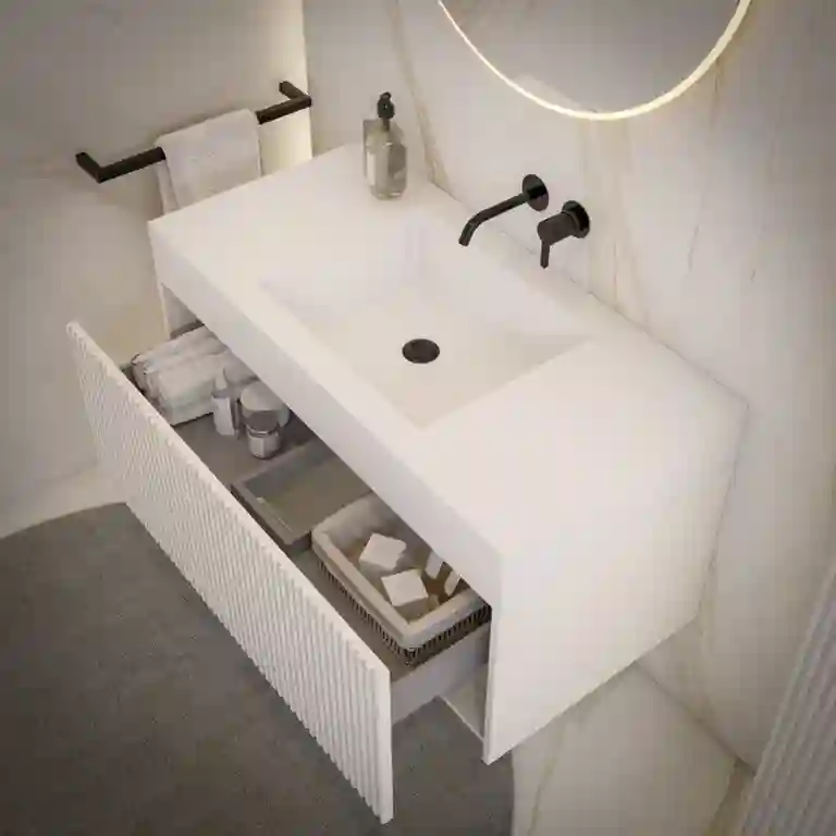 O movel casa de banho bancada alta New Ripper redefine o conceito de elegância suspensa, combinando a solidez escultural de um tampo elevado em melamina com a leveza táctil de frisos verticais esculpidos na gaveta. A bancada alta eleva o lavatório—a sua cuba retangular integra-se com suavidade na superfície branca imaculada—convidando a um gesto de cuidado que parece flutuar no espaço.
