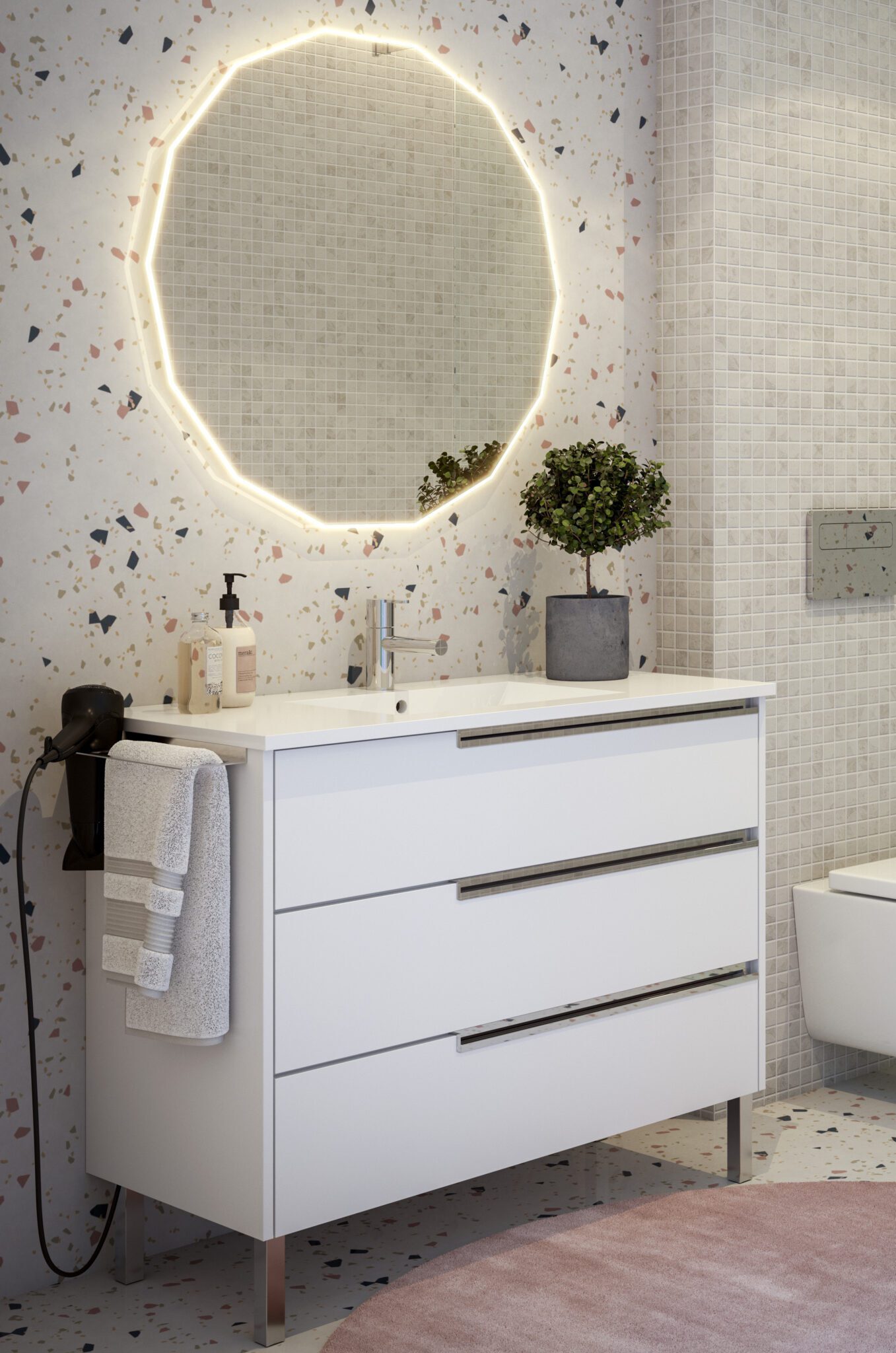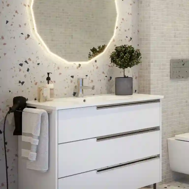O design do móvel de casa de banho com pés Bahia foi pensado para integrar-se em vários estilos de decoração: do minimalista ao contemporâneo. A superfície do tampo em melamina permite apoiar o lavatório cerâmico sem juntas aparentes, enquanto a sua resistência ao desgaste e à humidade garante anos de utilização sem perder o aspeto cuidado.