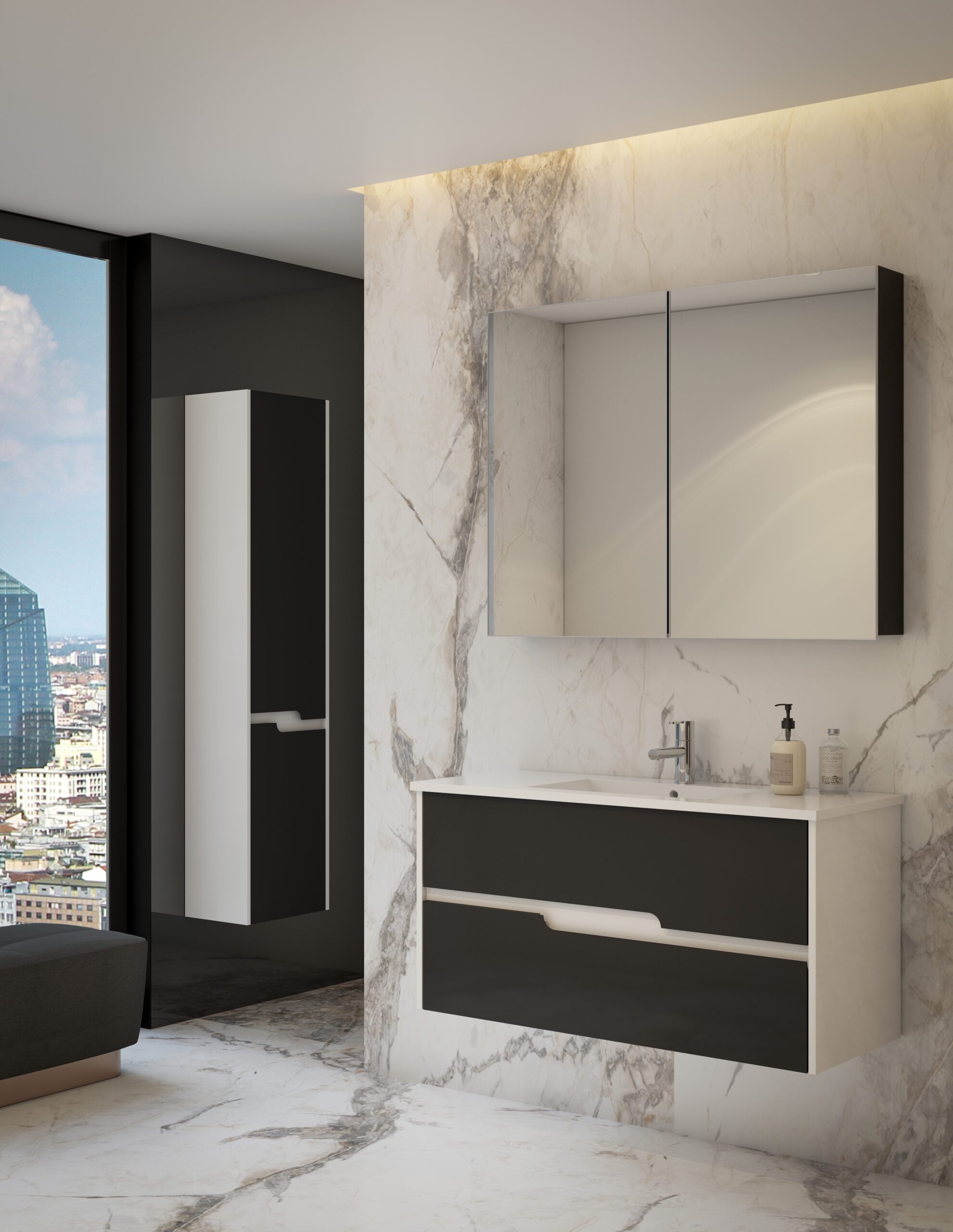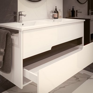 Este duo de gavetas abraça o tampo contínuo em melamina resistente, onde repousa um lavatório de encastrar de linhas retas que lembram a superfície tranquila de um lago espelhado. O contraste entre o branco nítido do tampo e as frentes escuras — disponíveis em antracite, grafite ou carvão — transforma o movel de casa de banho Helius gavetas num elemento de destaque, capaz de convocar silenciosamente os outros tons da decoração: o cinzento suave das paredes, o mármore suave do chão ou o metal escovado dos acessórios.