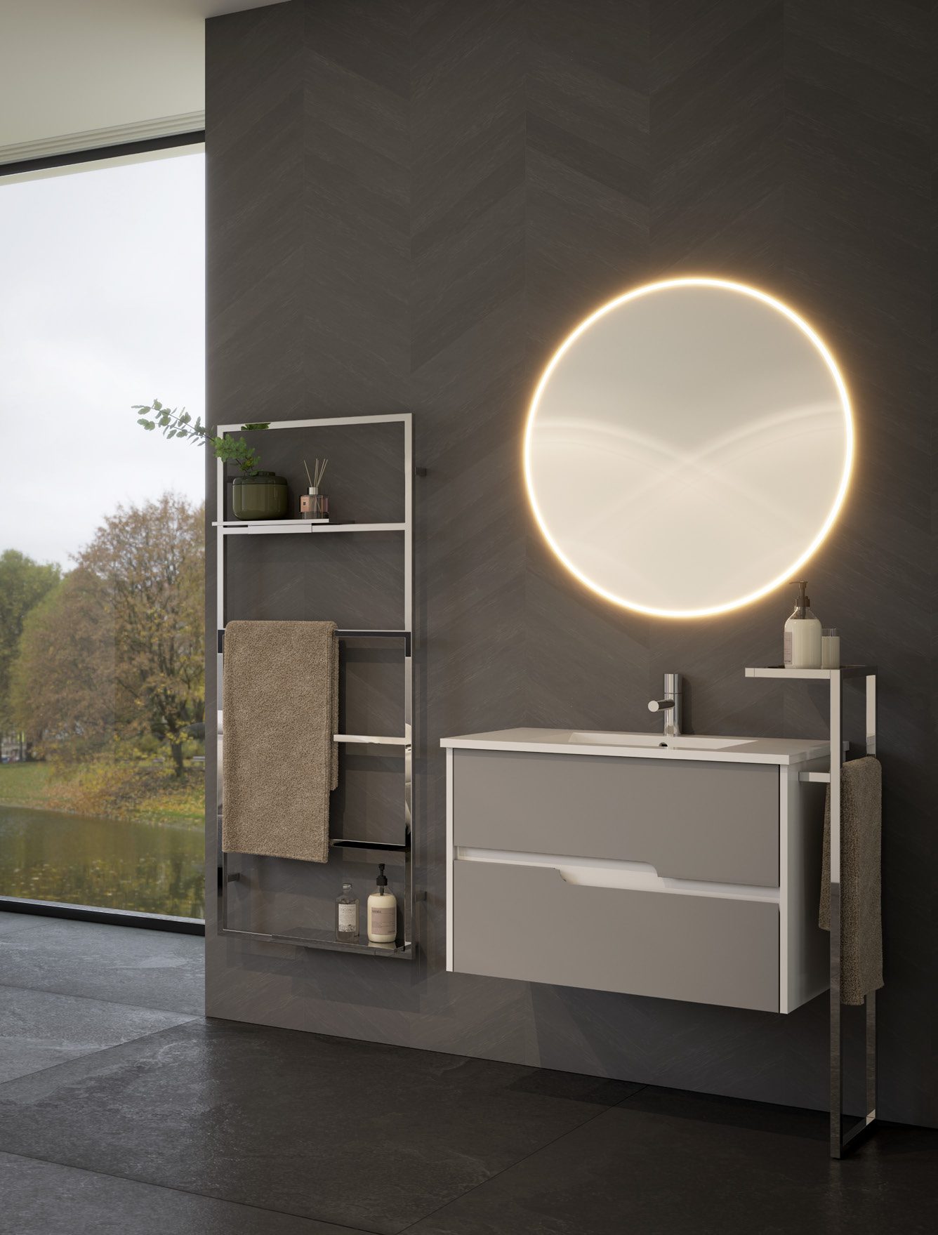 Imagine um espelho de grandes proporções, com perfil mínimo, refletindo a silhueta do Helius contra uma parede de mosaico mate. Acrescente uma prancha em madeira esculpida no canto para apoiar vasos de cerâmica ou difusores de aromas, e verá como cada textura — lisa, riscada ou natural — se harmoniza num concerto de contrastes suaves.