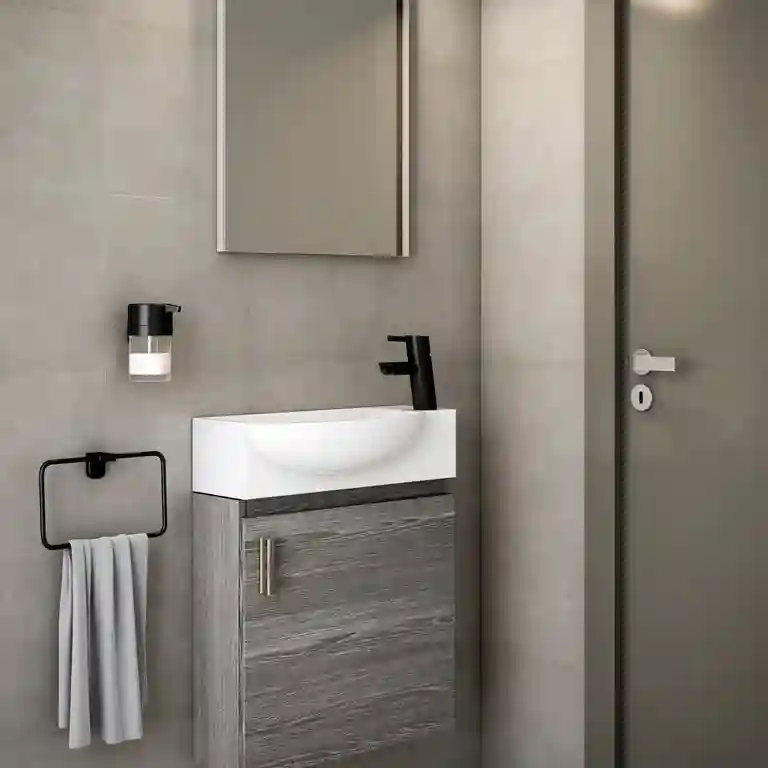 Para quem valoriza o detalhe, o Mini pode ser combinado com um espelho suspenso simples ou com iluminação LED integrada, sem risco de sobrecarregar visualmente o espaço. A melamina de alta densidade é resistente à humidade, assegurando durabilidade mesmo em ambientes de uso intenso. Os cantos arredondados do tampo protegem contra impactos e facilitam a limpeza dos ângulos mais críticos.