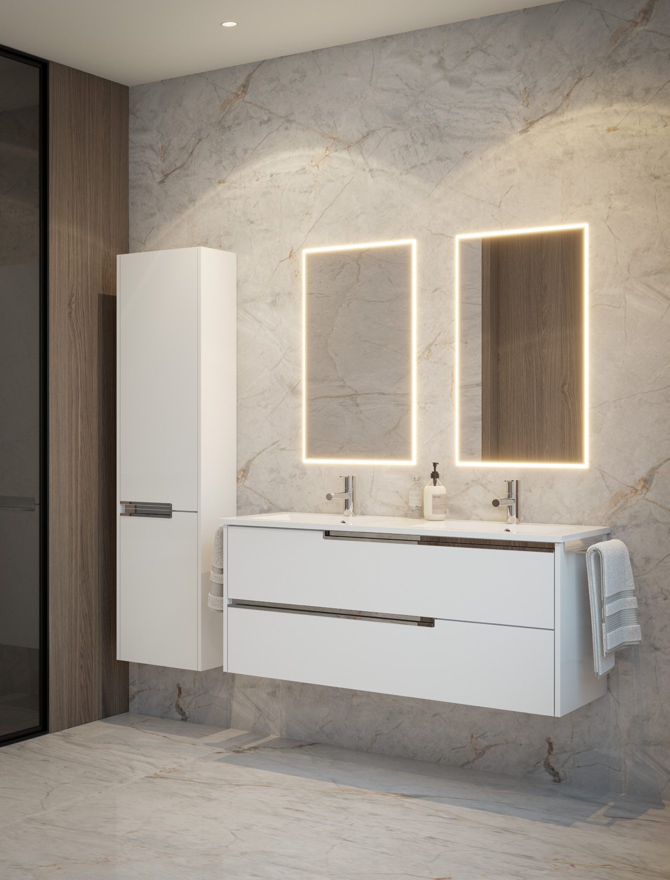 Por baixo do tampo, o Bahia suspenso dispõe de duas gavetas amplas com frentes lisas e puxadores embutidos em metal. Cada gaveta desliza com precisão, oferecendo espaço interior suficiente para colocar organizadores, caixas e cestos, permitindo categorizar toalhas, produtos de higiene e acessórios de beleza. A ausência de pés dá ao conjunto um efeito “flutuante”, enfatizando a sensação de amplitude, mesmo em casas de banho de menores dimensões.