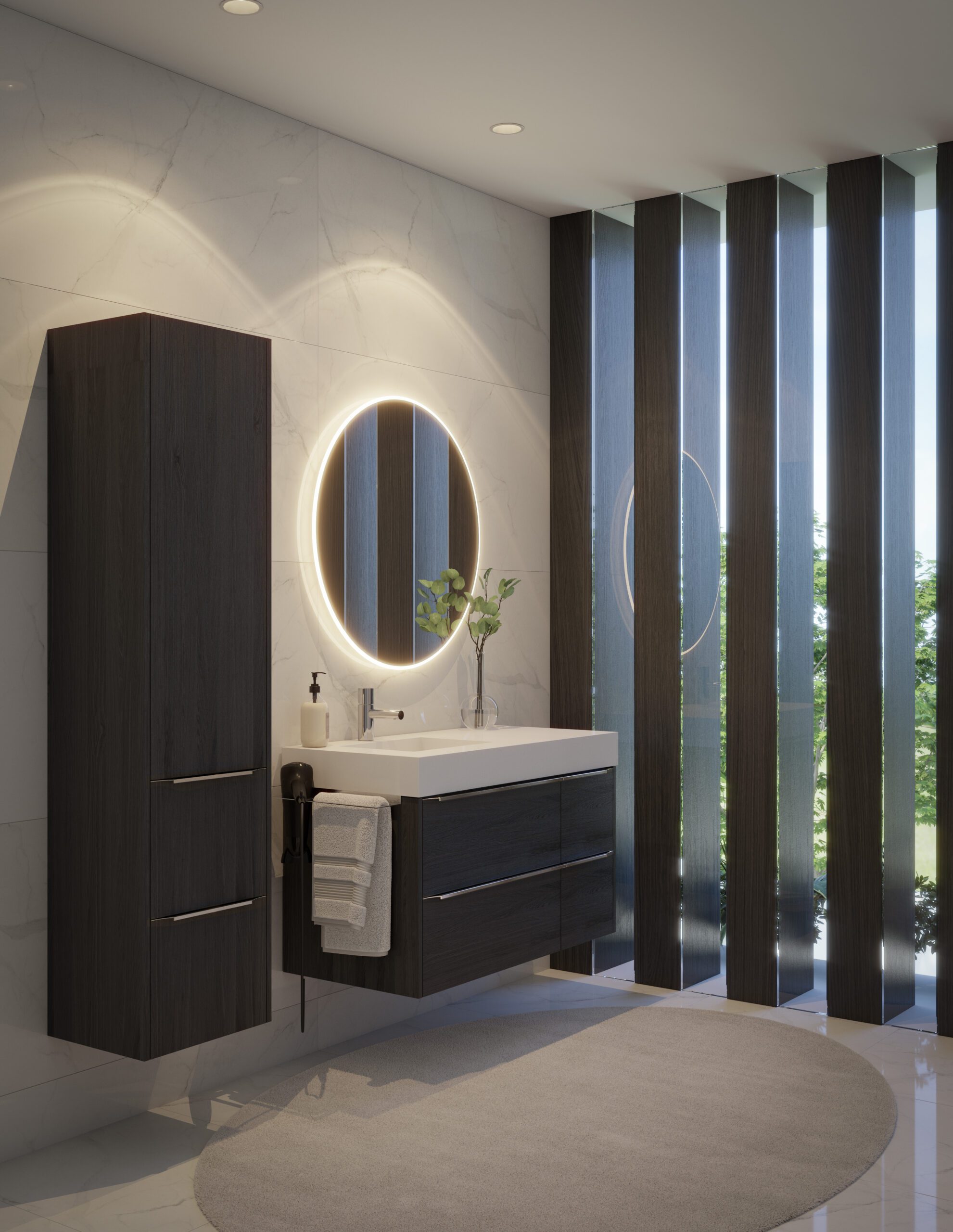 Quando a luz suave do espelho redondo com aro LED abraça a superfície lisa da bancada em Gel Coat, nasce um ambiente de serena elegância. O móvel de WC com bancada Gel Coat Samos define-se pelo contraste emocional entre o corpo profundo em melamina de tom cinzento antracite e o tampo branco imaculado, pronto a receber o lavatório de encastrar.