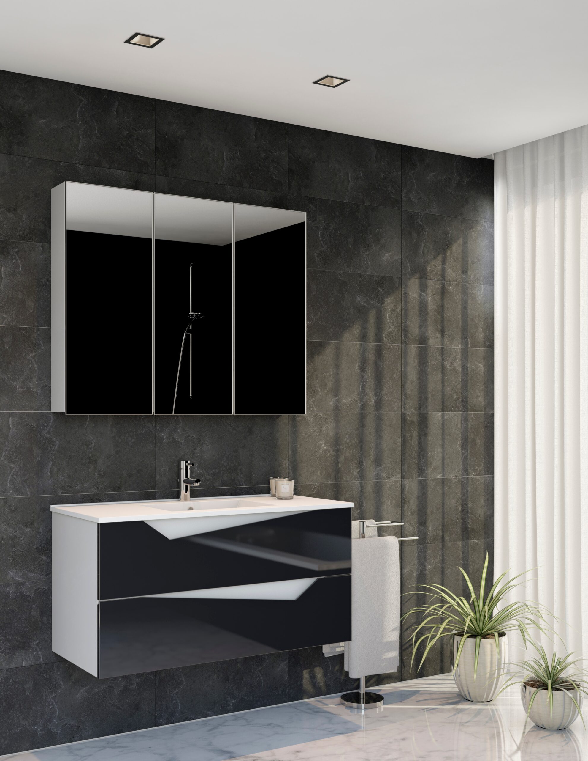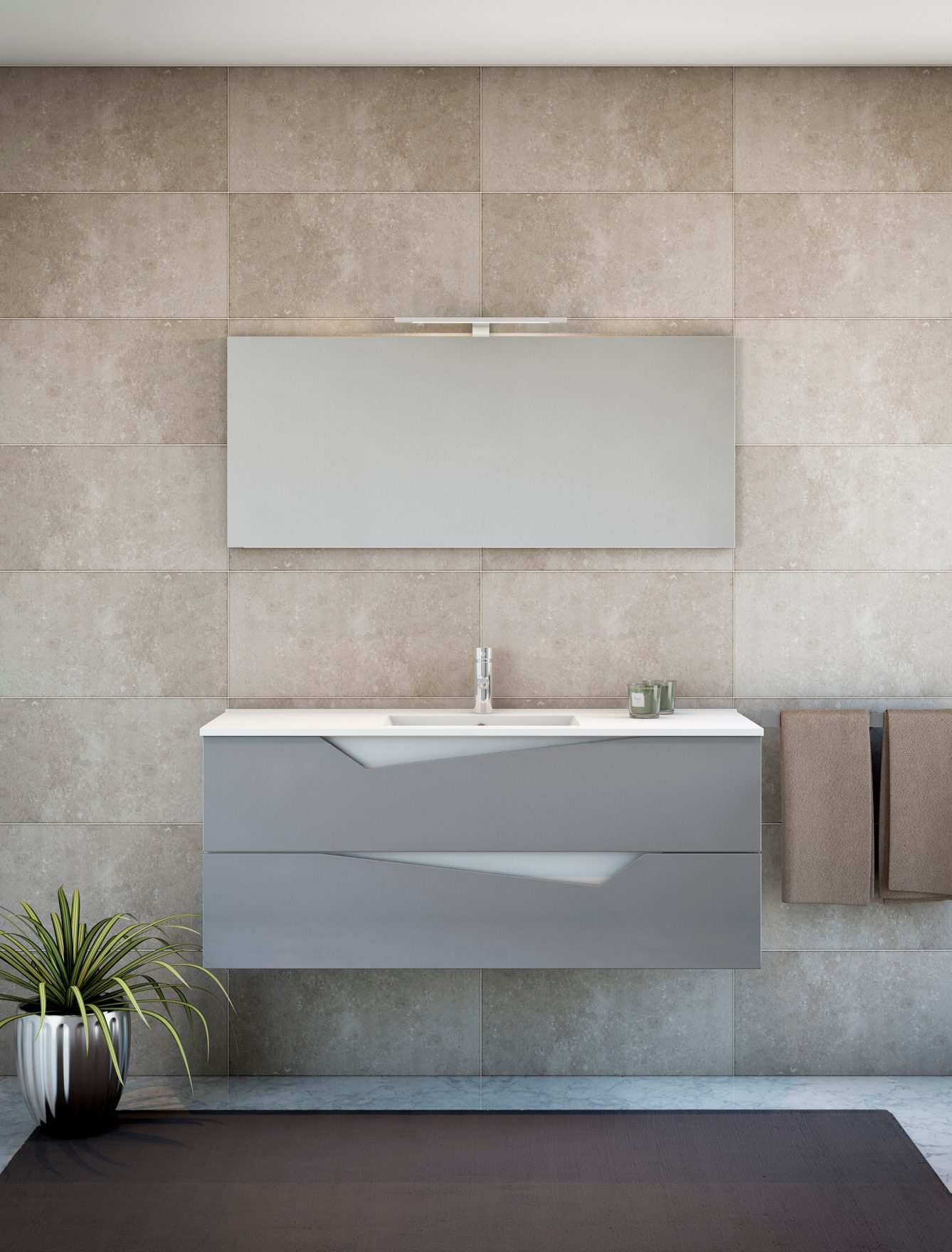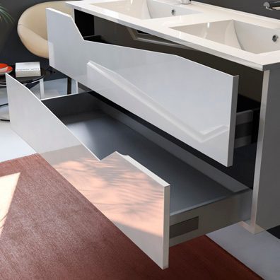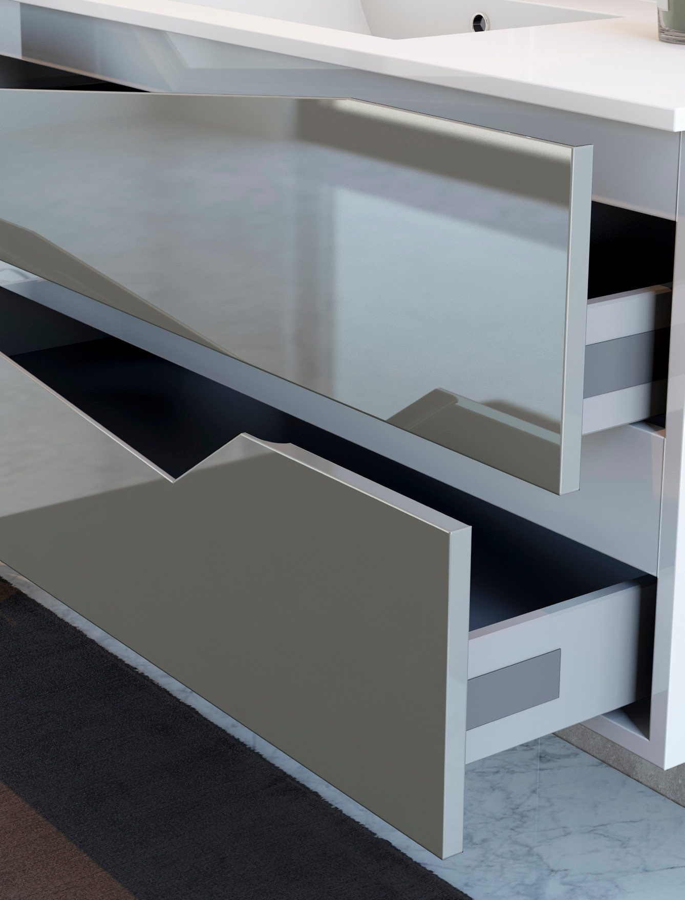 Imagine um móvel que paira na parede como uma obra de arte moderna: o móvel suspenso de casa de banho Splendia combina gavetas esculpidas com recortes geométricos e a possibilidade de escolher a cor do interior de cada frente, criando um detalhe que reflete o seu estilo pessoal.