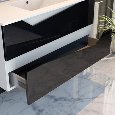 O móvel suspenso de casa de banho Splendia com gavetas esculpidas é mais do que arrumação: é um manifesto de design, onde cada recorte, cada cor e cada sombra conta uma história de estilo e emoção.