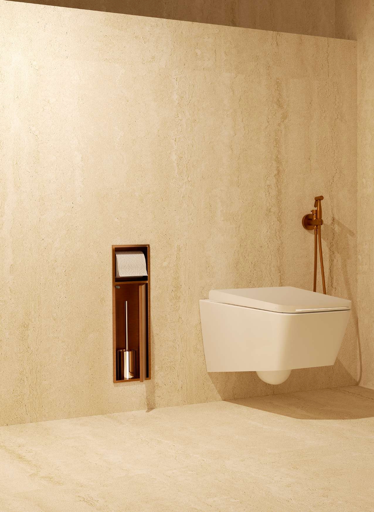 O suporte de rolos para casa de banho integrado é o toque de funcionalidade que completa o conjunto com distinção. Discreto e elegante, garante que o essencial esteja sempre acessível, sem comprometer o design. É a combinação perfeita entre o prático e o belo — um acessório embutido que passa despercebido pela harmonia e se destaca pelo detalhe.