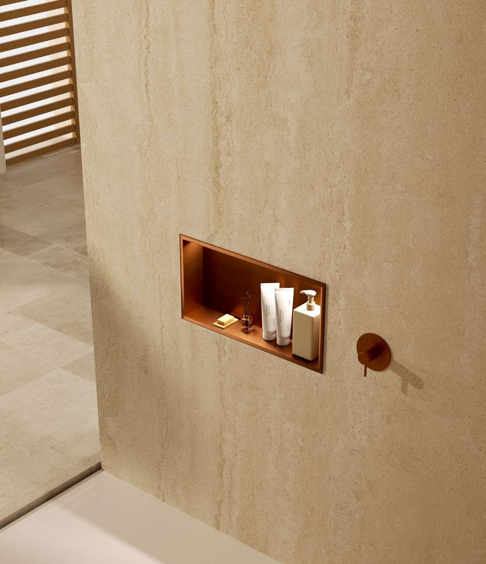 O formato retangular, com proporções de 30×60 cm, valoriza as paredes e cria um foco de luz que embeleza o ambiente. O nicho embutido com luz LED integra-se de forma fluída e contínua, como se fizesse parte da própria arquitetura. A iluminação difusa realça os tons dos revestimentos, sublinha volumes e desperta o olhar para os detalhes mais subtis.