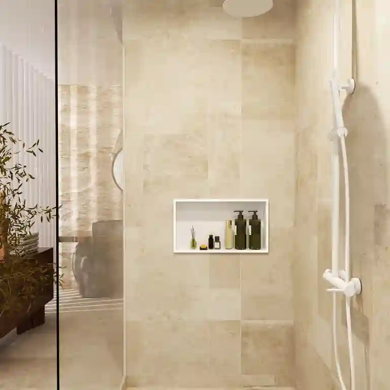 Em casas de banho de design contemporâneo, este nicho de duche moderno é sinónimo de sofisticação discreta. Os seus acabamentos disponíveis em várias cores permitem combinações infinitas — desde tons neutros e naturais até contrastes marcantes com revestimentos escuros. É perfeito para quem procura criar um ambiente elegante, sereno e funcional, onde o essencial é também belo.