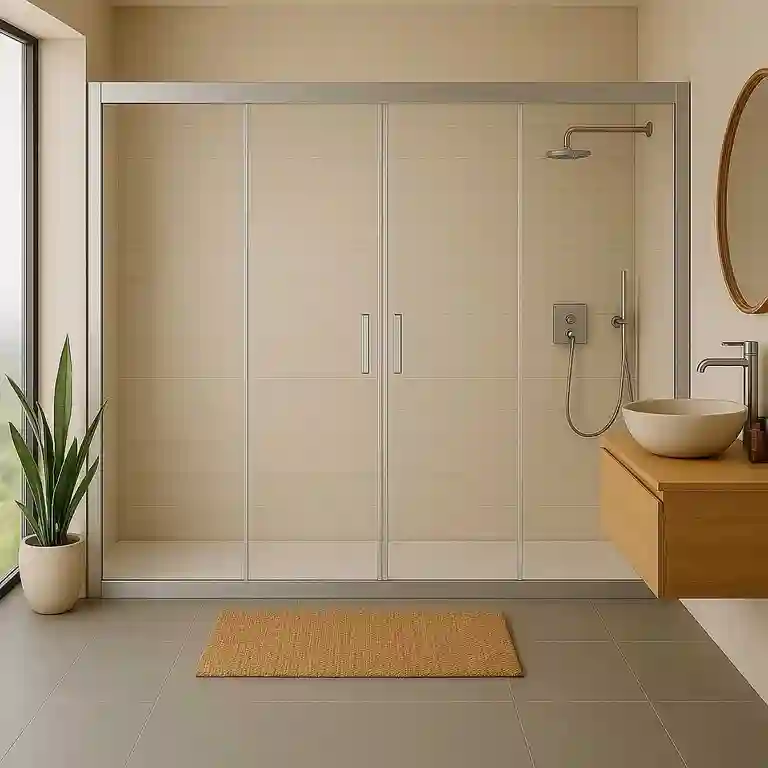 Montado sobre um perfil inferior de baixo perfil, nivelado ao pavimento, e um perfil superior discreto, o Painel de Duche Frontal 2 Portas 2 Fixos Altamira assegura total estanqueidade sem interromper a continuidade do chão. Os perfis em alumínio anodizado — disponíveis em inox escovado, preto mate ou cromado brilhante — agarram o vidro com firmeza, enquanto as rodas ocultas garantem um deslizamento silencioso e suave das portas. Quando as portas se encontram abertas, recolhem-se junto aos painéis fixos, oferecendo um acesso pleno e sem restrições ao interior do duche.