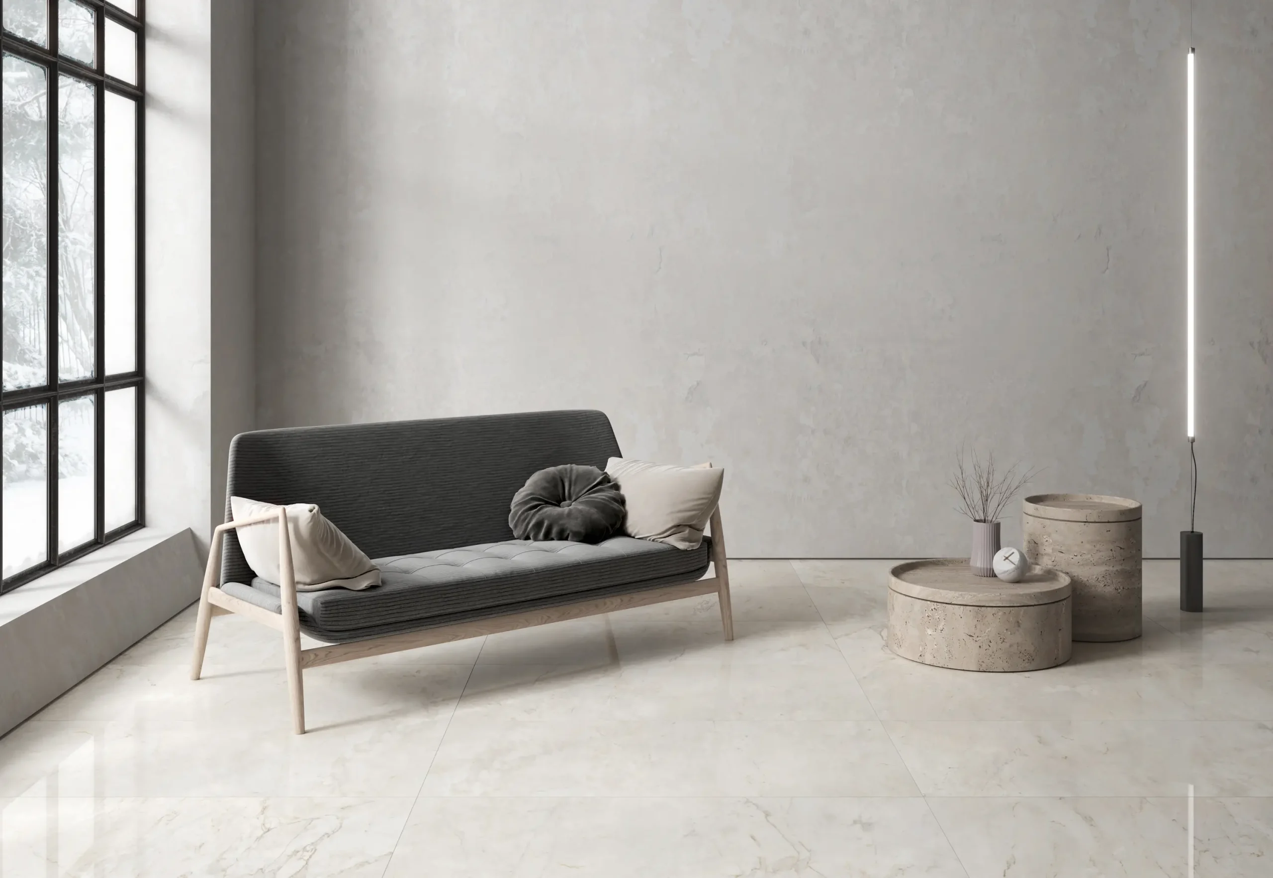 O pavimento cerâmico Crema Delicato polido destaca-se também pela sua versatilidade decorativa. Combina com madeiras claras, metais dourados, mobiliário minimalista ou clássico, e paredes texturadas em tons neutros. É ideal para projetos de design de interiores que exploram tendências como o estilo Japandi, escandinavo ou contemporâneo minimalista.
