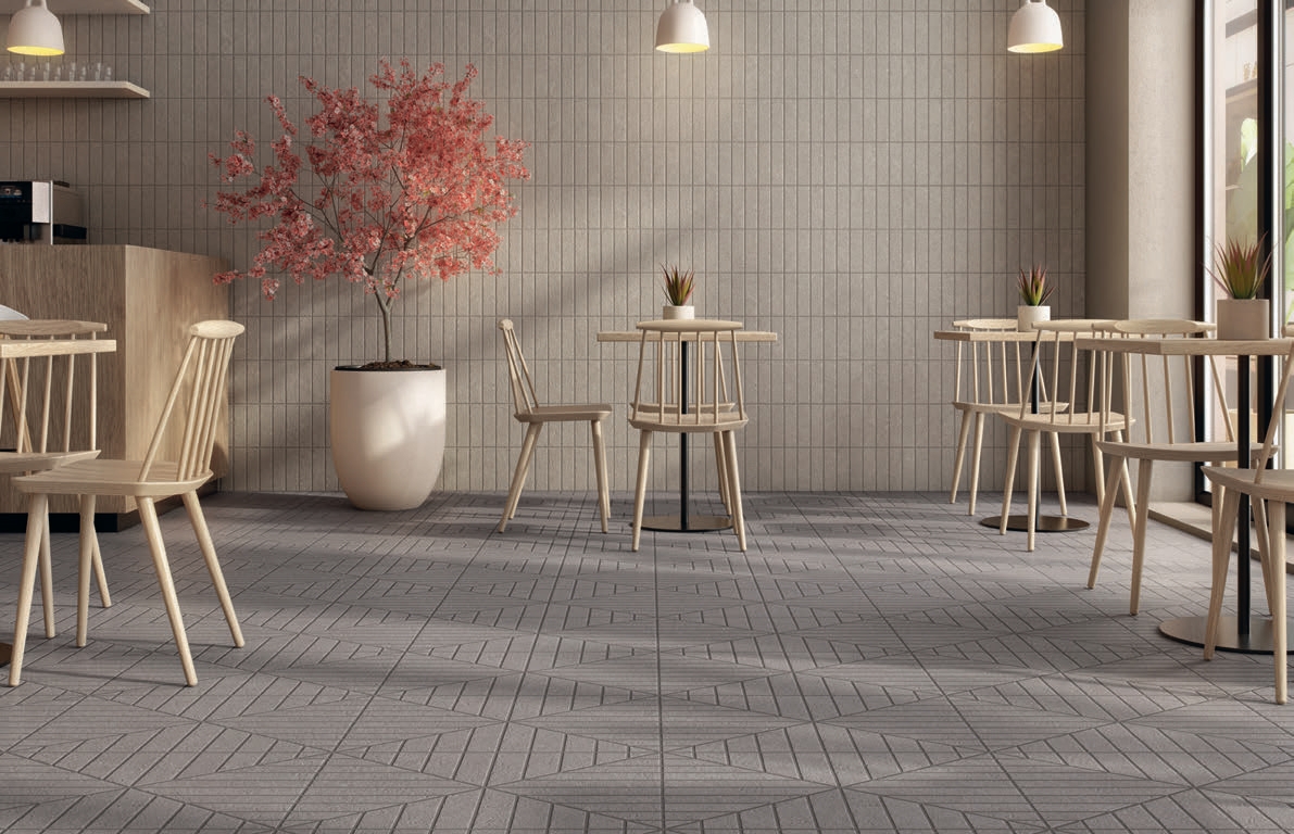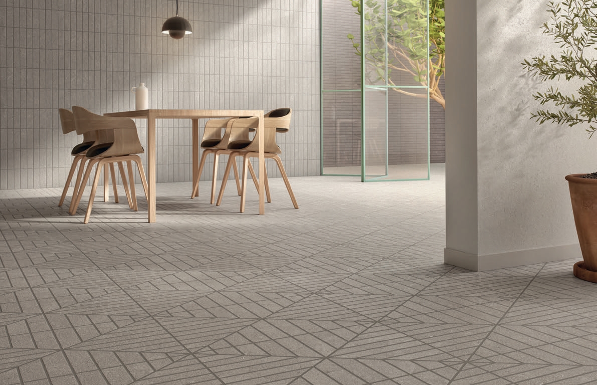 Em interiores como salas, cafés ou restaurantes, este pavimento adiciona um elemento visual surpreendente sem perder a leveza, destacando móveis em madeira clara e detalhes naturais. Em espaços exteriores, como varandas e pátios, ele reforça a sensação de amplitude, segurança e originalidade, mantendo a resistência típica da cerâmica mesmo em áreas de maior desgaste.