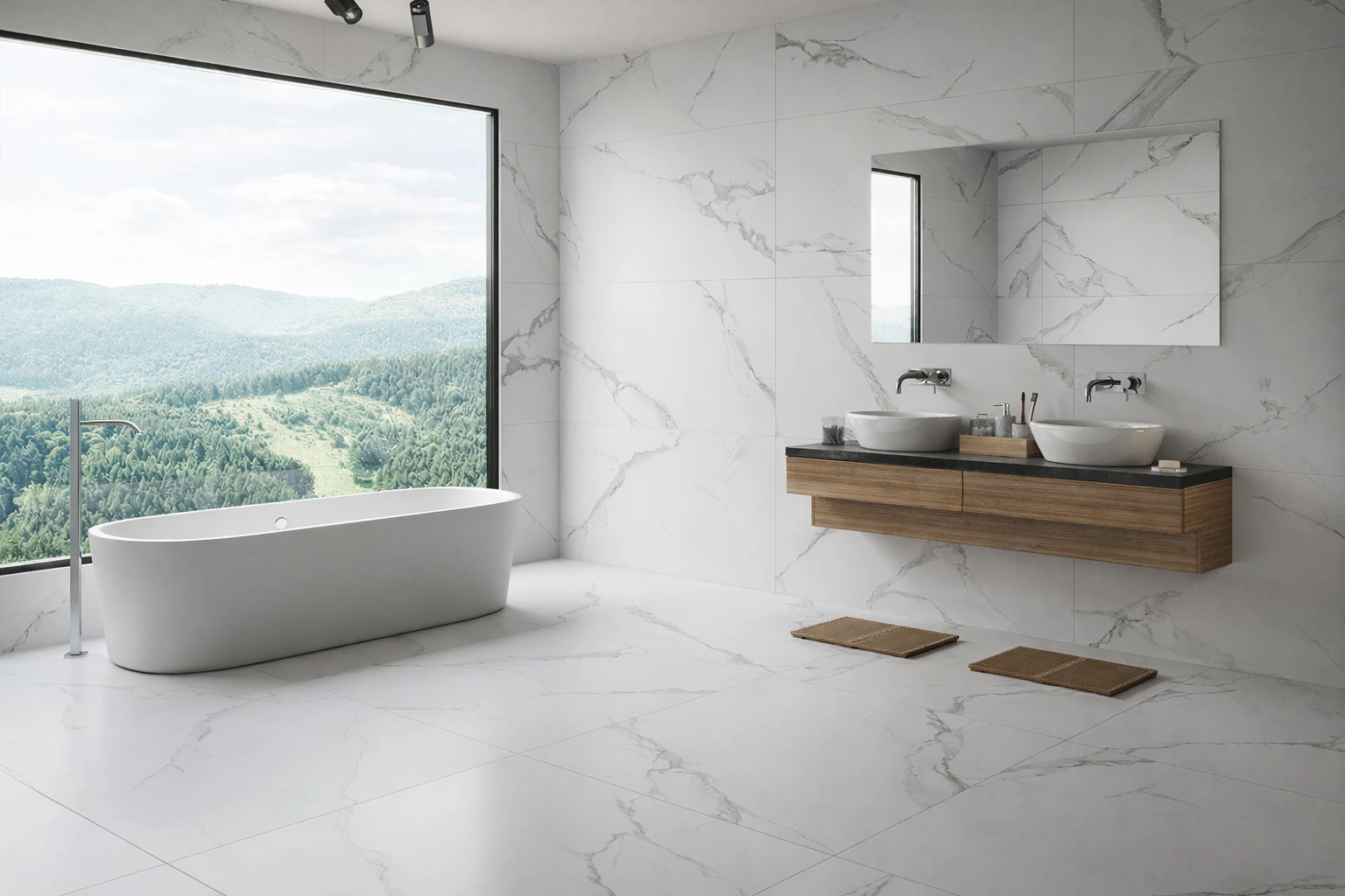 Graças ao seu formato retangular, o pavimento cerâmico 60×120 permite uma aplicação com menos juntas visíveis, criando superfícies amplas e visualmente contínuas. Esta característica torna o mármore branco Mazaganparticularmente indicado para salas, casas de banho, suítes, corredores e projetos de interiores onde se pretende reforçar a sensação de espaço e fluidez.