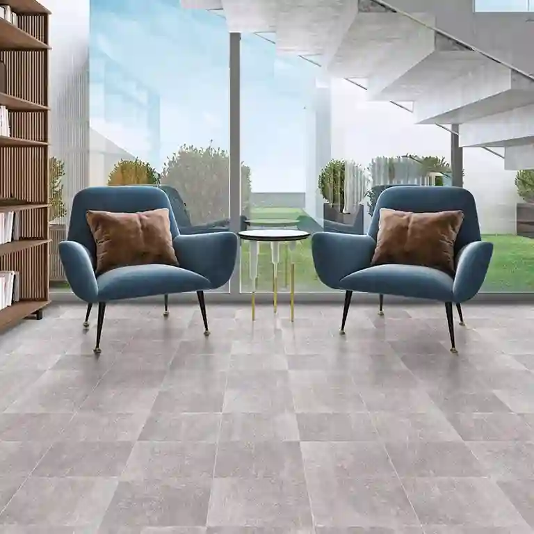 Ideal para salas de estar, bibliotecas, escritórios ou zonas comerciais, este pavimento oferece a praticidade da cerâmica com o impacto visual da pedra natural. A leitura homogénea do padrão confere continuidade ao ambiente, ampliando visualmente os espaços e criando uma sensação de permanência e serenidade. O pavimento cerâmico pedra Basalto não é apenas uma solução estética — é também funcional, durável e fácil de manter. Cada peça reproduz com fidelidade as nuances naturais do basalto, desde os tons cinzentos profundos até às variações subtis que simulam a mineralidade da rocha. Esta atenção ao detalhe garante um acabamento de excelência, capaz de se destacar tanto em projetos residenciais como em espaços públicos com exigência de design.