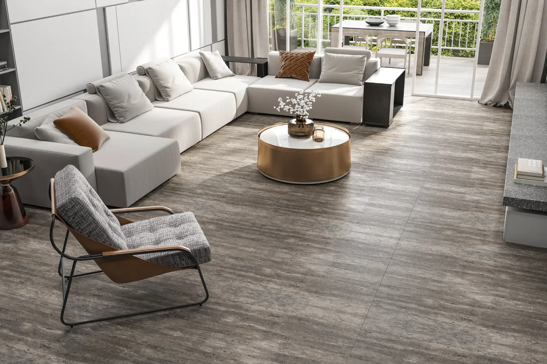 A cor escura do pavimento cerâmico travertino Nero confere carácter e sofisticação ao ambiente. É um pavimento que não grita — envolve. Ideal para quem procura criar interiores modernos, com uma base sólida e visualmente equilibrada, onde o chão assume um papel estrutural no design do espaço. Em salas amplas, cria continuidade e profundidade; em ambientes mais contidos, acrescenta personalidade e contraste.