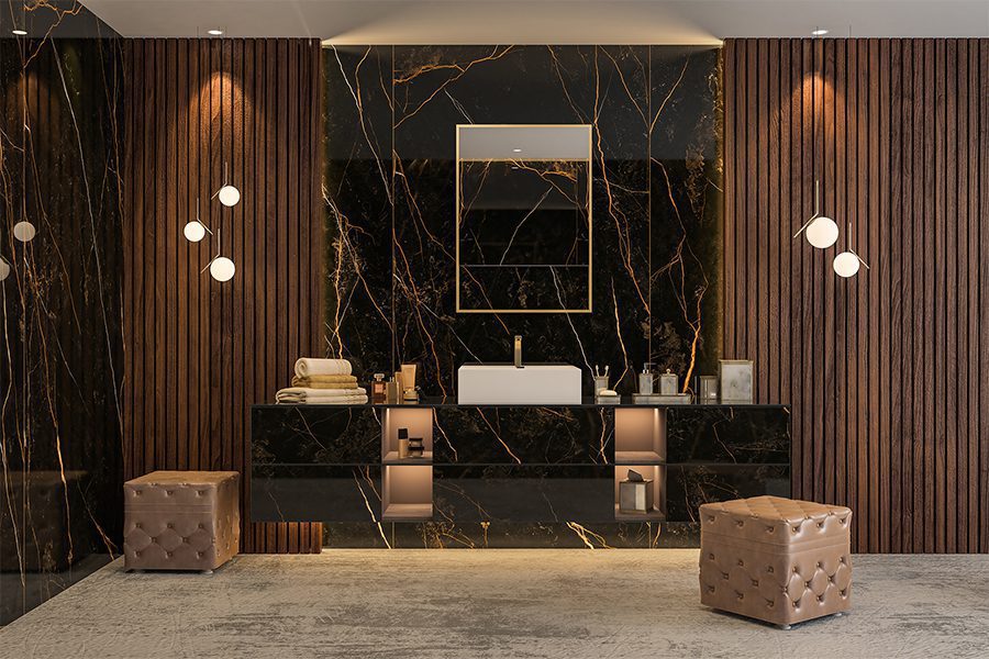 O contraste entre o fundo escuro e os veios dourados torna este revestimento uma peça de destaque, capaz de transformar espaços simples em ambientes sofisticados. A sua estética é versátil, permitindo combinações com elementos em madeira, metais dourados ou texturas naturais, criando composições que vão do clássico ao contemporâneo.