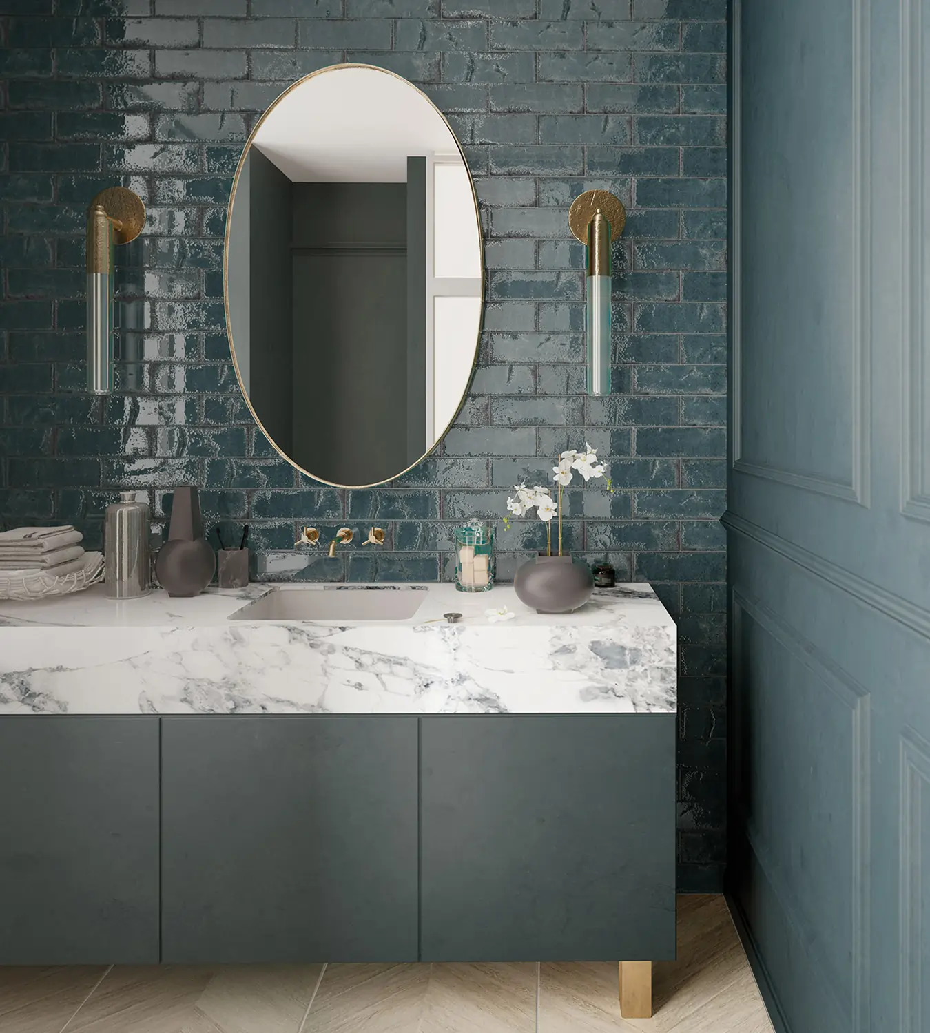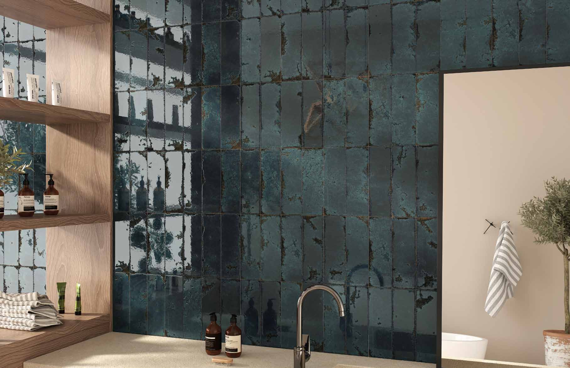 Disponível em várias cores – do verde intenso ao azul petróleo, do cinza envelhecido ao branco leitoso –, o revestimento cerâmico Alma permite brincar com contrastes ou criar ambientes monocromáticos cheios de personalidade. Na casa de banho, transforma a parede do lavatório ou do duche num ponto focal arrebatador. Na cozinha, confere profundidade e sofisticação ao backsplash, especialmente quando combinado com mobiliário de madeira natural, cobre ou mármore branco.
