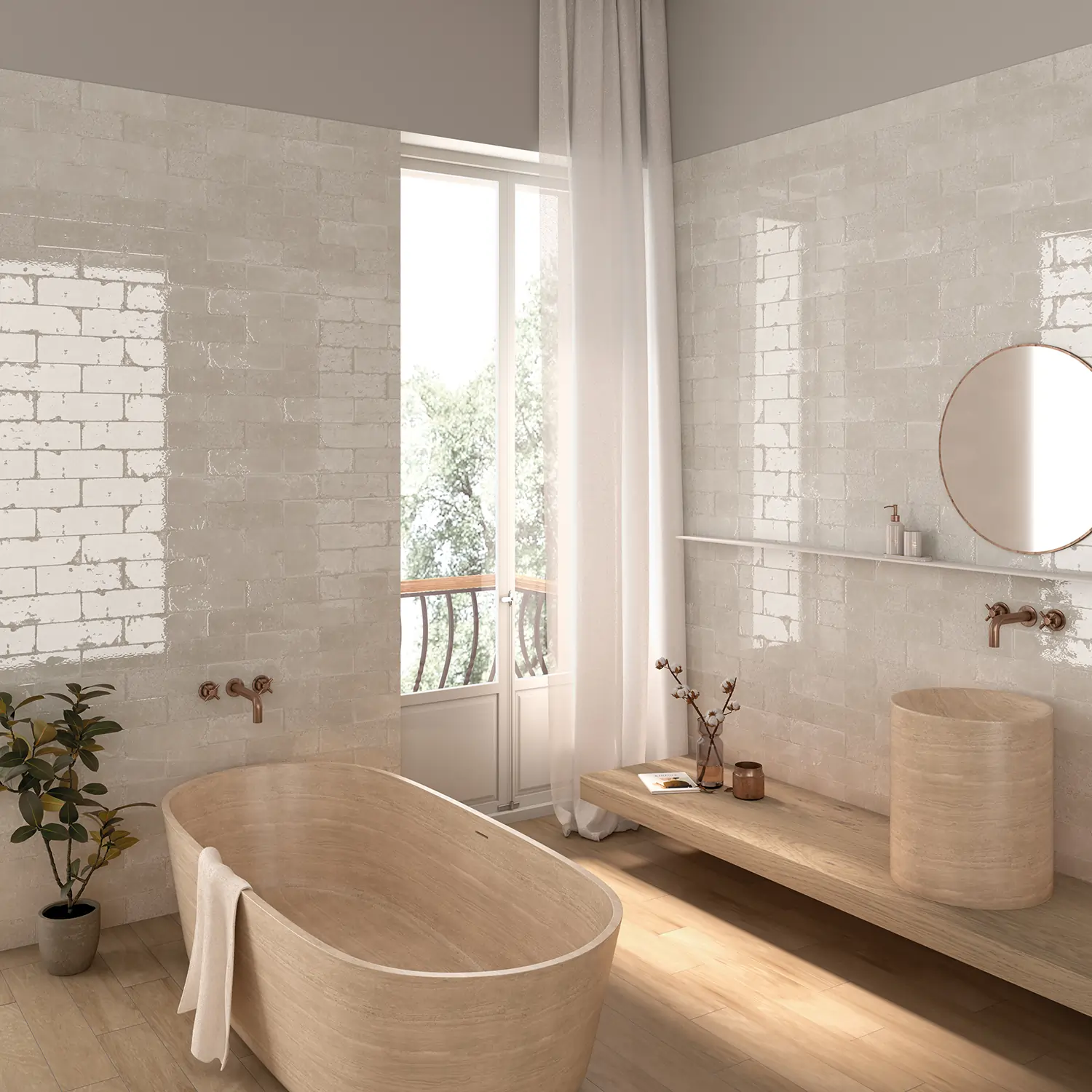 Ao toque, as peças Alma revelam uma superfície ligeiramente ondulada, intencionalmente imperfeita, que lembra o charme rústico das cerâmicas artesanais. Este carácter manual é reforçado pela irregularidade controlada das bordas e pelo brilho intenso que reflete a luz de forma poética. O efeito visual remete às antigas fábricas de azulejos vidrados, conferindo um aspeto artístico e quase boémio às paredes.