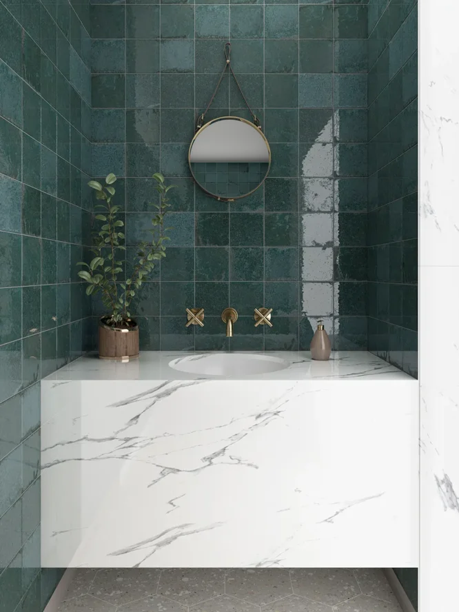 Funciona lindamente com materiais como madeira natural, mármore branco ou metais dourados — uma base versátil para projetos de decoração de interiores cheios de identidade. Para quem quer fugir do convencional, os tons variados permitem criar mosaicos únicos ou harmonizar com elementos neutros.
