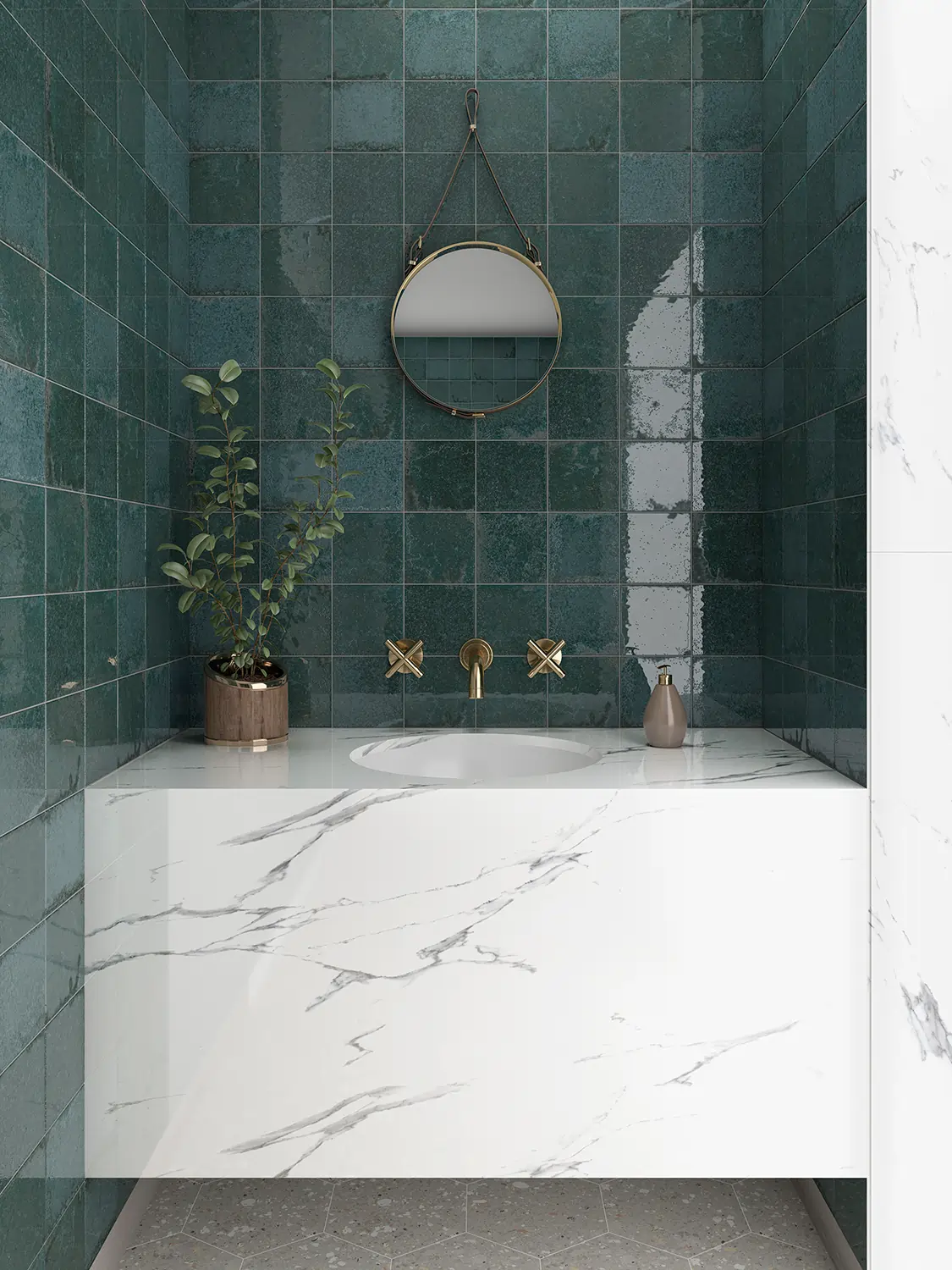 Ideal para espaços que valorizam luz e textura, o azulejo Alma reflete os raios do dia com suavidade, criando profundidade e movimento. Em ambientes mais escuros, assume um papel dramático e sofisticado. É a escolha perfeita para quem procura um revestimento cerâmico brilhante que combine tradição, inovação e beleza sensorial.