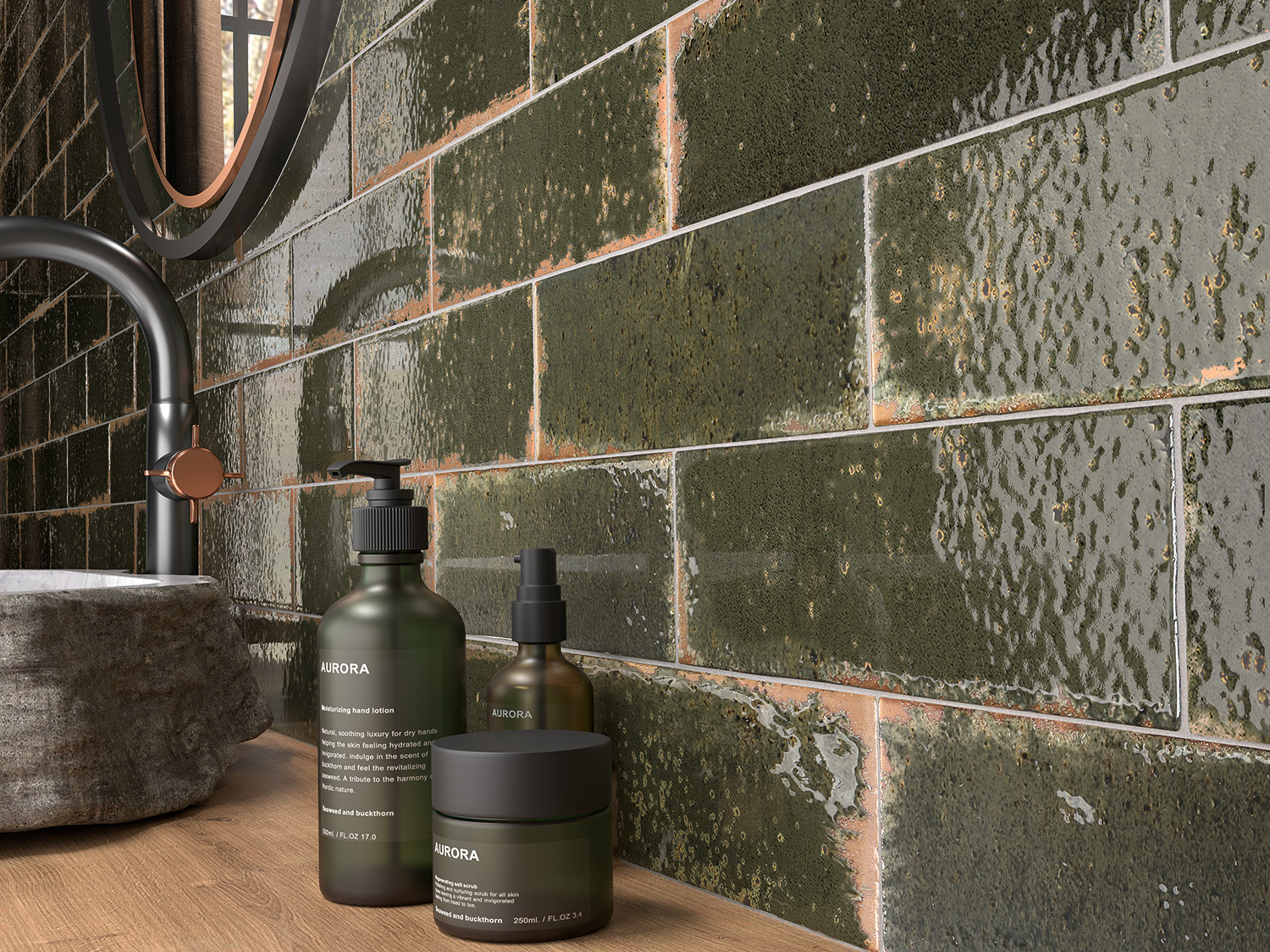 A paleta cromática inclui tons profundos e envolventes — verdes musgo, amarelos ocres, cinzas azuis e terracotas que evocam o calor do mediterrâneo. Este azulejo vitrificado adapta-se com naturalidade tanto a ambientes clássicos como a interiores mais arrojados. Em cozinhas, destaca-se como revestimento de parede com personalidade, ao passo que em casas de banho confere um ar boutique, semelhante aos interiores de spas urbanos ou hotéis de charme.