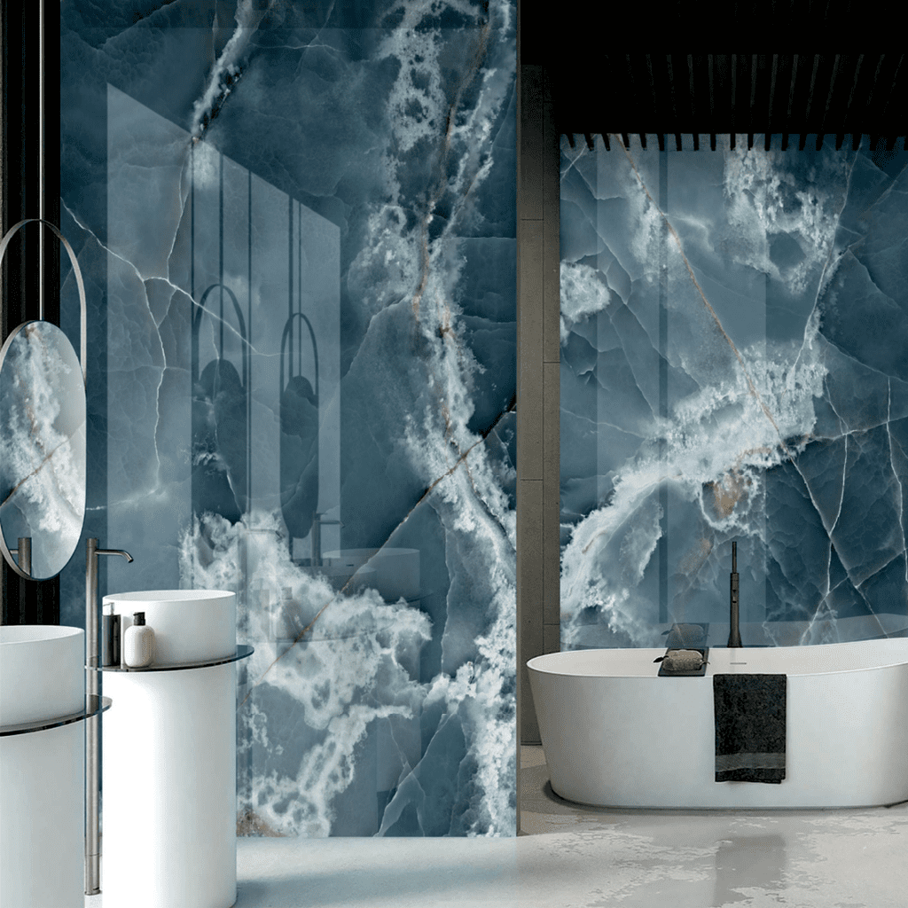 Perfeito para áreas de destaque, este revestimento adapta-se a diversas aplicações, como paredes principais, pisos de grande impacto, bancadas ou até mesmo mobiliário exclusivo. Seja em casas de banho sofisticadas, salas de estar elegantes ou ambientes comerciais de luxo, o revestimento lâmina Onyx Oceano 120×260 é a escolha ideal para quem procura um revestimento que combine requinte e personalidade.